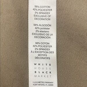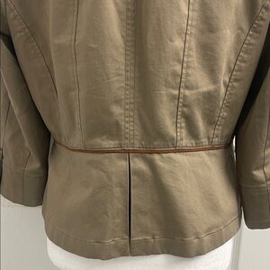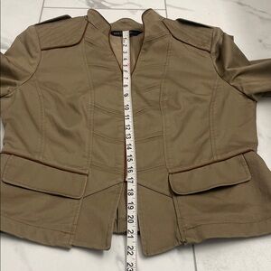 Elevate your wardrobe with this stylish White House Black Market military-style jacket. The olive green color and cotton blend outer shell material make it a perfect addition to any fashion-forward woman's collection. The jacket features a zip-up design, shoulder pads, and a regular size fit for a flattering look. Can be worn for dressy occasions or casual wear. Front zipper, button details at shoulders and cuff.