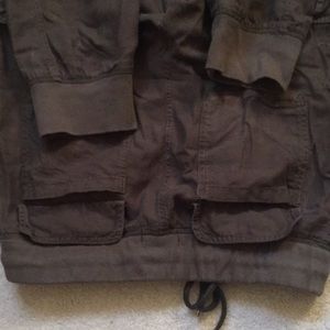 Green utility pants with lots of pockets.