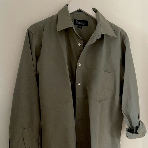 Crisp, olive button front shirt. Men’s 16. Fits like a Women’s large. Oversized. Amazing condition.