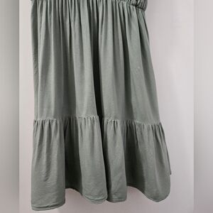 Adorable medium olive green mini with a ruched bodice.Deep v-neckline and strap to hold the cups closer together, less likely for any malfunctioning. Adjustable straps for best fit from top. Waist is very stretchy and the cut is so flattering. Gives me garden greek goddess, dress up with wedges and jewelry, winterize with a turtleneck and leggings underneath, cover up your swimsuit at the beach or wear it taking the washing to the laundromat. Versatility that comes unlined with an open back, this was from old Aero too, not bluenotes owned Aero.