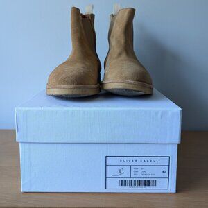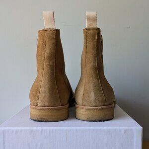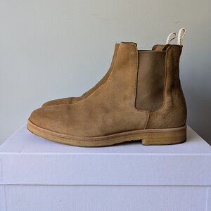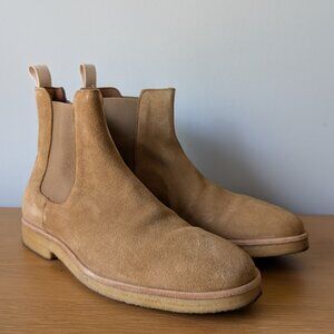 Stylish tan suede Chelsea boots. Sleek design with elastic side panels. Comfortable and versatile.