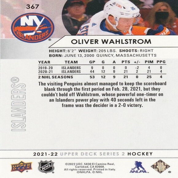 Oliver Wahlstrom - 2021/2022 Upper Deck Series 2 Hockey Card