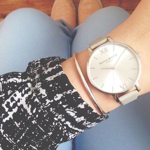 This ladies Olivia Burton Big Dial watch is made from stainless steel and is powered by a quartz movement. It is fastened with a grey leather strap and has a silver dial.