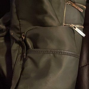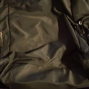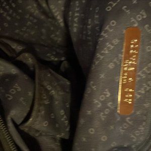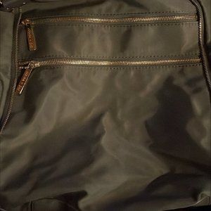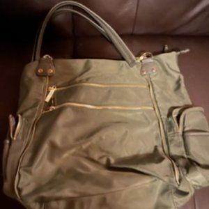 Really versatile tote. Very roomy and has lots of zippers; great for carrying textbooks, laptops, etc. In good used condition with some scratches on the gold metal. Approximately 16 x 18 inches.