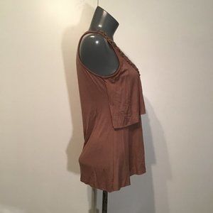 Pretty tank in a Rosewood or Dusty Rose shade, with gold metallic trim at neckline, and raw edges.. Stretchy and comfortable.