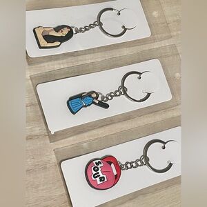 Set of three trendy Olivia Rodrigo keychains. Perfect for accessorizing bags or keys. Brand new giftable
