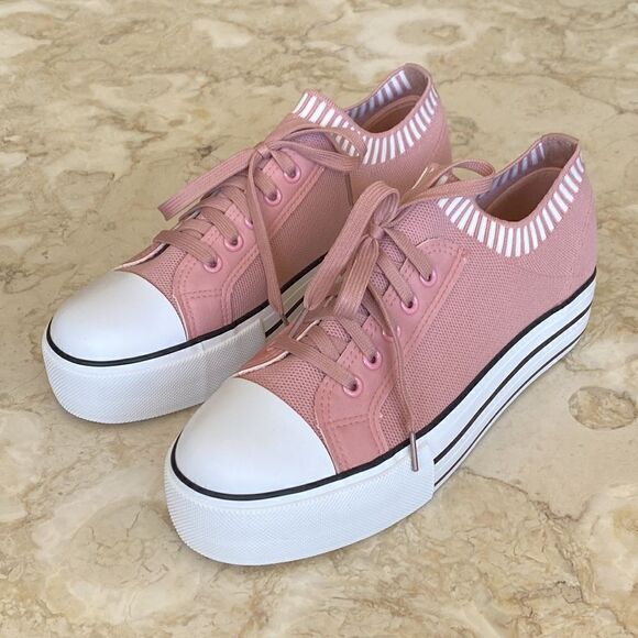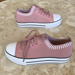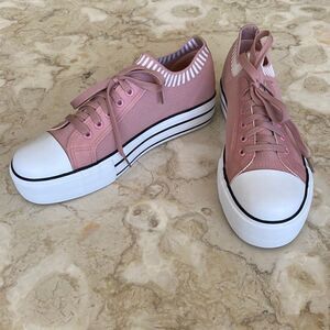 Trendy and cute, Olivia Millie’s Audrey lace-up vulcanized sneaker will have you feeling on top pf the world. Style them with your favorite shorts, jeans or skirt. These are practically in as new condition, but be aware of a spot on the outside of the right shoe.