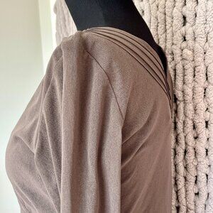 Elevate your wardrobe with this Olsen brand brown V-neck blouse in size medium, featuring metallic square embellishments, structured pleating, and three-quarter sleeves. This top blends sophisticated detail with seasonal versatility, making it a perfect choice for fall layering, office chic, or evening outings. Pair with tailored trousers, dark denim, or a midi skirt for a polished look. Add a structured blazer or longline cardigan for cozy sophistication. Ideal for workwear, dinner dates, or seasonal events.