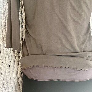 Olsen blouse, brown embellished top, V-neck pleated blouse, Fall 2025 fashion, size medium women’s top, workwear chic, elevated basics, three-quarter sleeve blouse, ruffle hem top, business casual outfit, minimalist glam, Canadian fashion brand