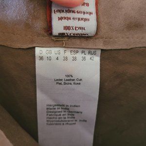 This beautiful 100% leather (suede) skirt in a neutral taupe colour is a great piece for fall. Featuring two side buckles that are adjustable for width and a wrap style with a button and clasp closure, it has a retro 70s feel. It is in very good pre-loved condition but has a small pen mark on the front left front (see picture) which is reflected in the pricing. Due to the folds of the skirt and variations in the suede, it is not very noticeable when worn. Although it is marked a size 4, it fits larger due to the a-line style of the skirt (see measurements). From a smoke free and pet free home.