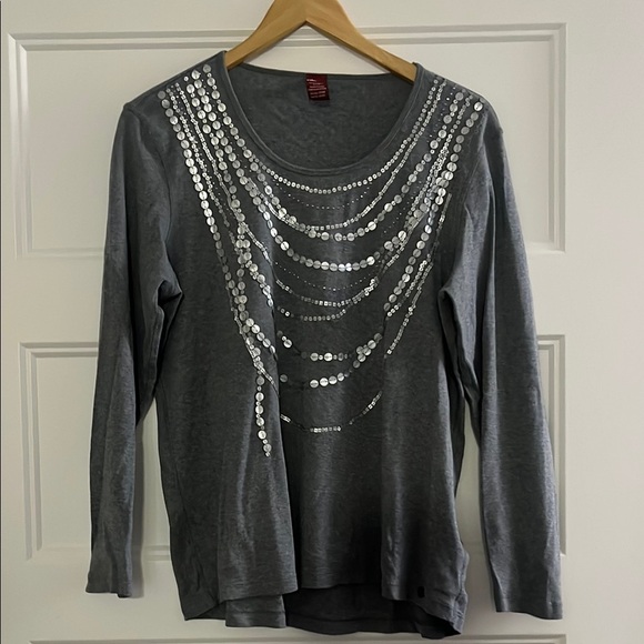 Elevate your style with this chic gray top featuring stunning sequin embellishments. Perfect for adding a touch of sparkle to any outfit.