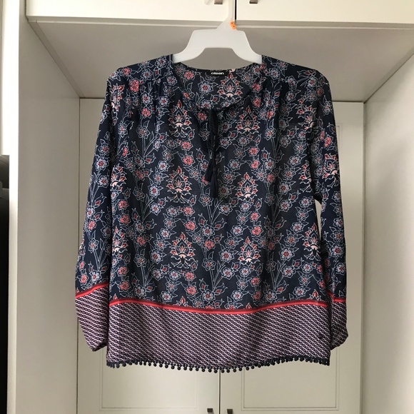 Olsen Navy /Pink Red Pattern Peasant Blouse Top Women’s M/L