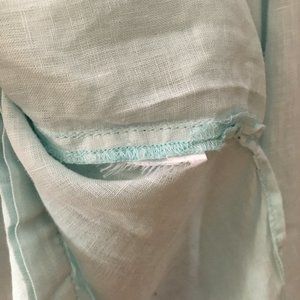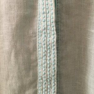 Excellent preowned condition, powder-blue, linen, button down shirt by Olsen. This is a gorgeous well made, high quality linen shirt. Although a bit wrinkly in the image, all garments are steamed and ironed prior to shipment. Long, lightweight and comfortable. The buttons are hidden behind an embroidered closure. Very nice details.