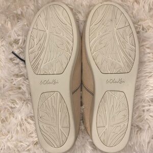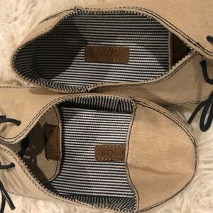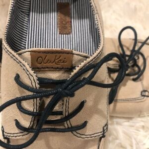 OluKai Heleuma canvas shoes, size 7. Tan and navy color, with a blue lace.