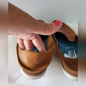 Stylish tan leather slip-ons by Olukai. Ideal for everyday wear.