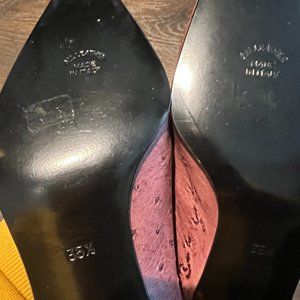 These shoes are a light maroon ostrich leather with a kitten heel. They are Ombeline Paris in size 35.5 in excellent/mint condition.