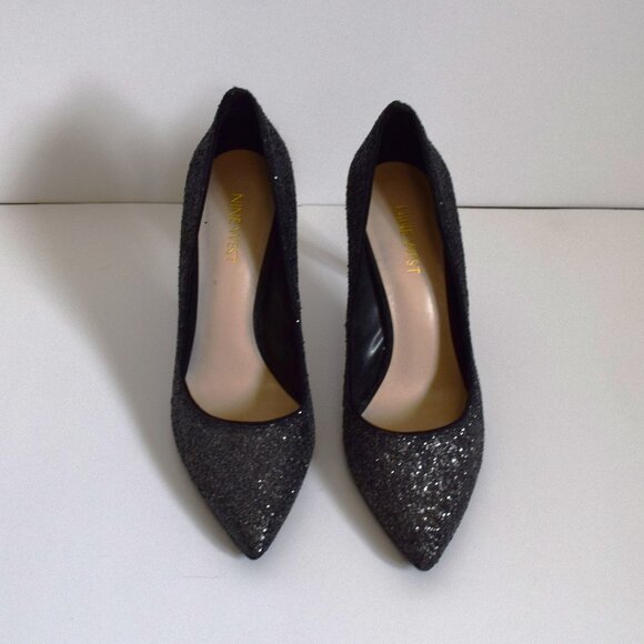 Gently used but still in good condition! The heels are encrusted in glitter that fades from black at the top, down to silver at the toe. Glitter is largely intact as shoes have only been worn a handful of times. Heels measure 10 cm.