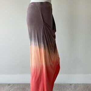 Taupe/peach/coral ombre midi skirt with left side pleating, elastic waistband and open front is the perfect summer skirt. This sarong style skirt has gorgeous colours, easy to wear and super flattering with some show of the leg.