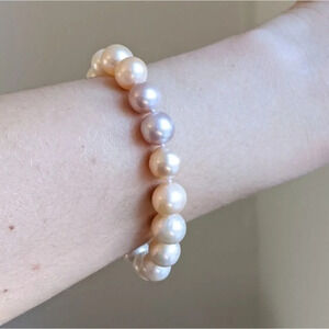 9mm in different shades of white and pink freshwater pearls, mounted with knots, Silver clasp rhodium finished with zirconia set (close set)