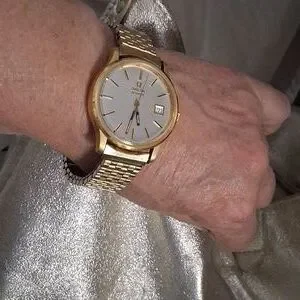 Elegant Omega watch with a 10k gold finish. Features a classic design with a date display.