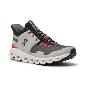 Stylish On Running sneakers. Features gray, black, and red design. Comfortable and modern.