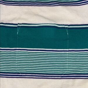 This polo shirt features a striped pattern with deep teal, white, and sage green colors, short sleeves, and a casual sporty style.