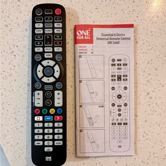 One For All Essential 6 universal remote control with multi-device compatibility. Features a sleek black design with colorful buttons for easy navigation.