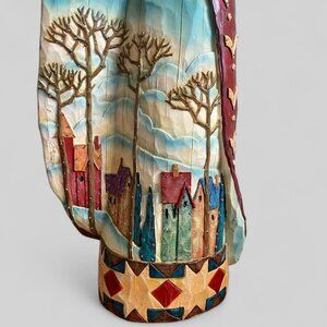 One Of A Kind Hand Crafted Lighted Folklore 20" Santa. Wood look Resin, hat, beard, trees, houses, chevrons on 1 one side, & teddy bear with auto changing led lights through 7 colours. Plug in with spacer so you don't have to unplug from the wall when lights not in use. See photo where teddy bear leg appears reglued which I don't find noticeable unless up close. From a smoke free/pet free home.