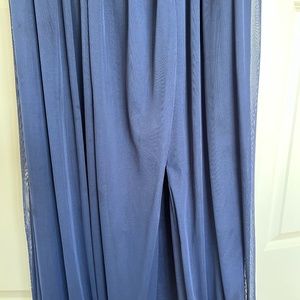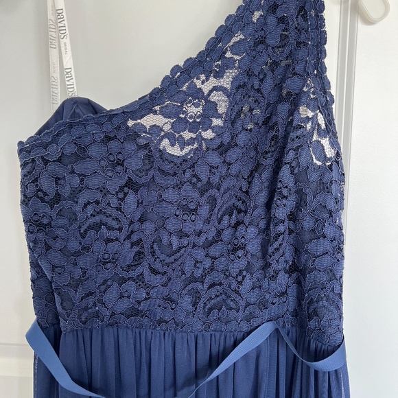 Davids Bridal's bridesmaid one shoulder A-line Lace dress with an envelope skirt. Navy Blue Size 14