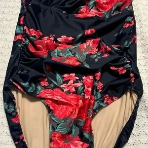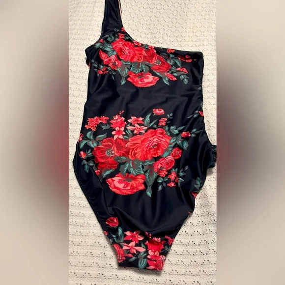 ALBION One shoulder Rose Bathing Suit. This swimsuit has ruching up the sides and provides good coverage with liner and tummy control.