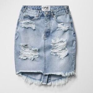 ONE TEASPOON High Waisted Long Rise Super Fitted Mid Thigh Length Pencil Denim Skirt With Destruction