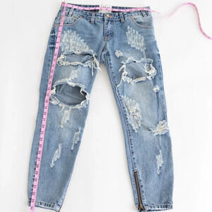 One Tea Spoon Blue "Trashed Free Birds" Extreme Distressed Straight Tapered Jeans.