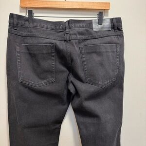 Awesome Baggies are a low waist medium rise relaxed leg jean. Double folded twisted cuff that can be unrolled. Tapered leg. Distressing on front. Washed black colour. Zip fly. 100% cotton, non stretch denim.
