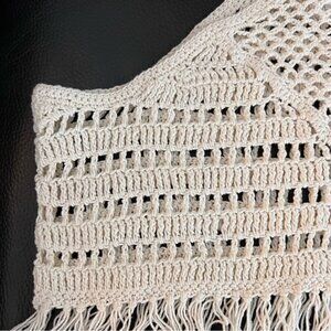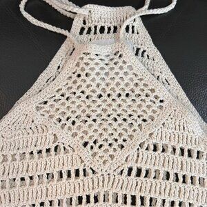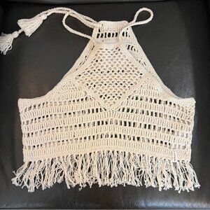 Incredible One Teaspoon crochet halter top. Cropped length with open crochet design, halter style neck line and fringe at bottom. Braided straps with tassels finish the look for the perfect festival wear top or pair with a bikini as a boho coverup!