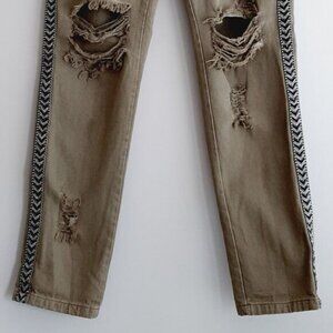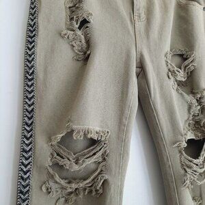 Stylish olive jeans with distressed details. Features side stripe accent. Perfect for casual wear.