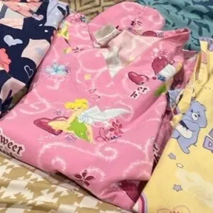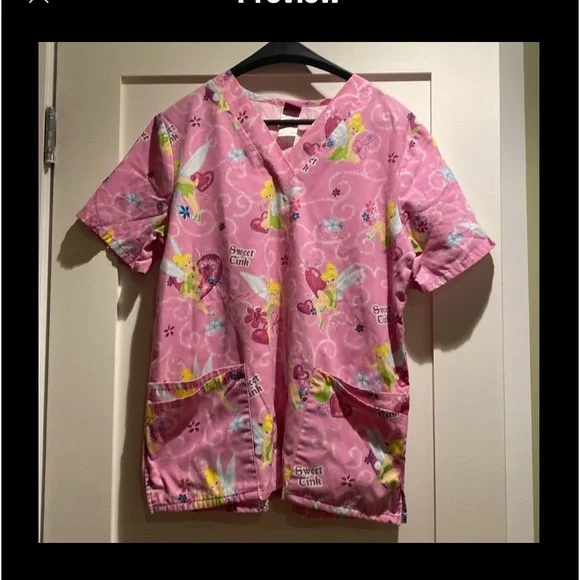 Hey Tinkerbell fans! Here’s a cute scrub to wear. Pink scrub with “Tink” all over! Size Medium. Has pockets. Great used condition!!!!
