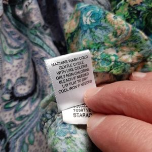 This wonderful, flowy top will keep you cool even in the hottest weather. It is loose and flowy with gathers under the yoke both front and back. Fluttery sleeves. It has 2 distinct patterns. A green, turquoise, yellow and black floral and a soft purple, pink and black paisley. It has been well loved but is still in very good condition. The label is missing but it is a One World top size L. From a smoke free home.