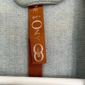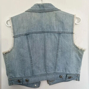 Stylish sleeveless denim vest. Features button closure and front pockets. Perfect for layering. Size medium Approx. Measurements: