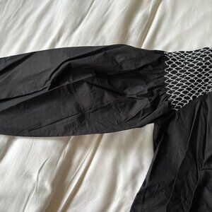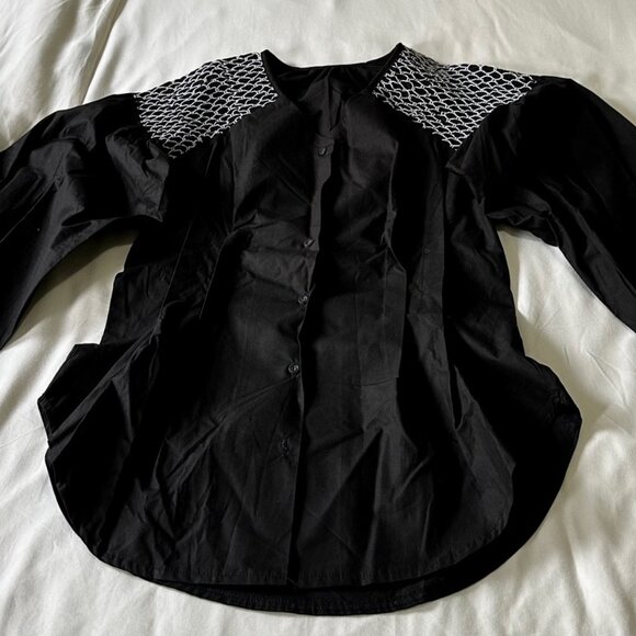 This dress shirt in black features a button-up design with a flattering fit that flares out at the hip. The long balloon sleeves add a touch of elegance, while the white mesh pattern on the shoulders provides a unique accent. This formal/business shirt is perfect for the fall and spring season sand is machine washable for easy care. Pair it with your favourite bottoms for a stylish and sophisticated look.