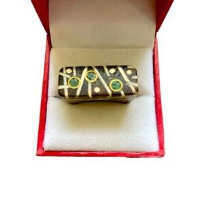 One of a kind, NB artisan made one piece wood ring. Rectangular shape with green and white inlays, made with some kind of a resin. Fits like a 6 1/4 size. Approx.