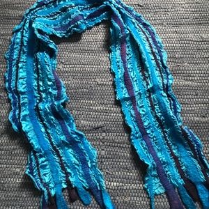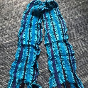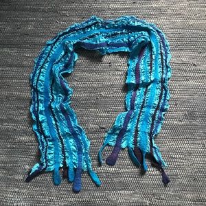 One of a kind! Handmade by artisans from PEI, the beautiful scarf feature a richednsilk on top of which wool stripes were felted. In beautiful shades of blue with a bit of purple. Measures approximately 7” Wide and about 50” inches long, not counting the felted tassels. In excellent used condition. No two were created the same.