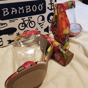 Made by Bamboo. Meaning the upper is made of bamboo. Natural bamboo is super breathable, but it is also moisture wicking and antimicrobial. The heel is about 2.25". Never been worn and in original box.