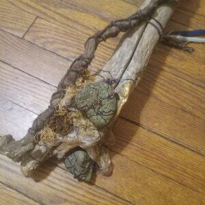Chovihani's stick is wrapped and bound with a tamarack root. Moss bits are Sealed in acrylic feathers from my budgies molting. This one of a kind book shelf art/wall art piece can be yours today