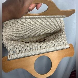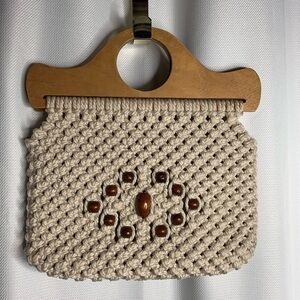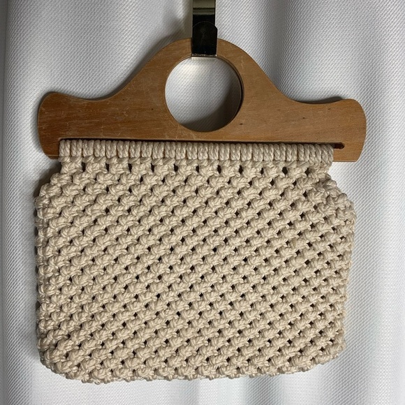 This gorgeous bag was handmade by someone and is one of a kind. It is so sturdy and strong. The wood handles are sold and beautiful. I wish I knew who made it as they deserve the recognition. EUC
