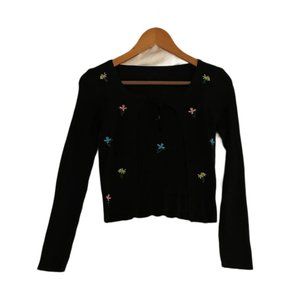 Handmade from a boutique in Kensington with applique flowers. Fabulous material, perfect condition. Fake camisole attached between cardigan. No tags.