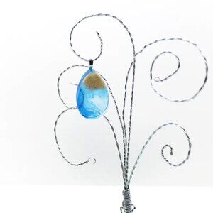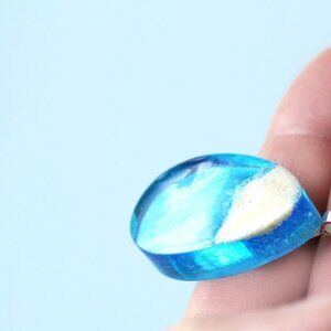 This tropical blue beachy pendant is crafted from white beach sand from the Caribbean, blue ink and resin. It shows the sea contour and a sandy beach