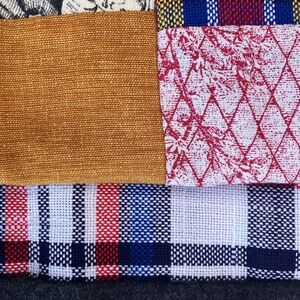 New infinity scarf made with a mix of reclaimed fabrics- French toile, denim, plaid and jersey. This is the perfect fall accessory.