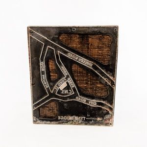A very unique pencil holder made from a printing plate mounted onto wood. Industrial and kinda weird, this is a very cool piece!