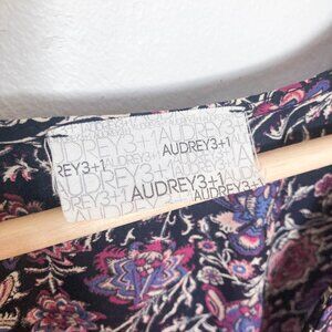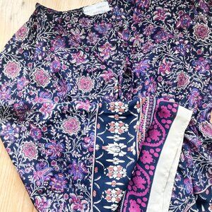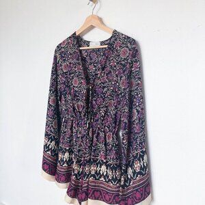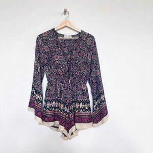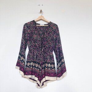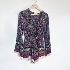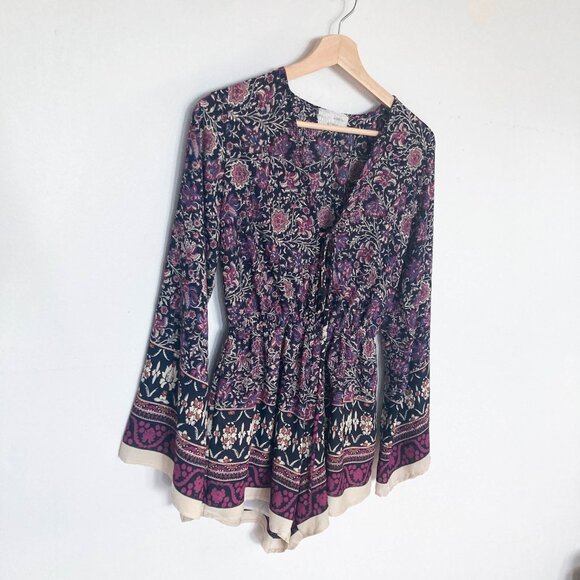 Lightweight long-sleeve romper with a cinched waist and tie-front detail. Features a rich floral print in plum, magenta, and cream with beige trim at the cuffs and hem. Easy, flattering fit with a relaxed bohemian feel.