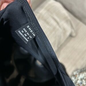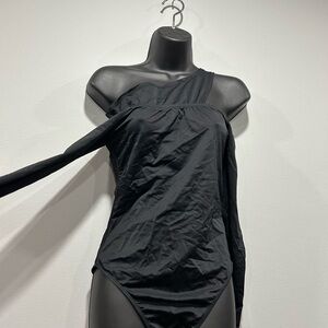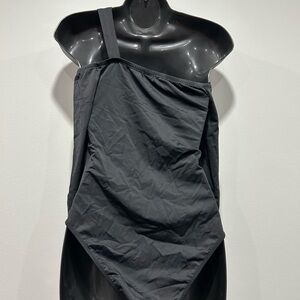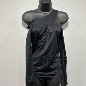 One shoulder black bodysuit. Size medium from SHEIN. Good used condition, just wrinkled. Asymmetrical sleeves. super cute! bundle to save :)